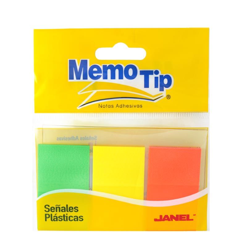 Memo Tip Señales Plásticas están pensadas para soportar manipulación constante, ya que están hechas a base de un material resistente a dobleces y salpicaduras. Puede escribirse sobre ellas, lo que las hace la solución perfecta para indicar, separar y resaltar detalles importantes. Disponibles en una amplia variedad de presentaciones y colores. Su adhesivo de alta tecnología permite despegarlas y pegarlas varias veces sin que la señal pierda su adhesividad. 3 colores: amarillo, naranja y verde