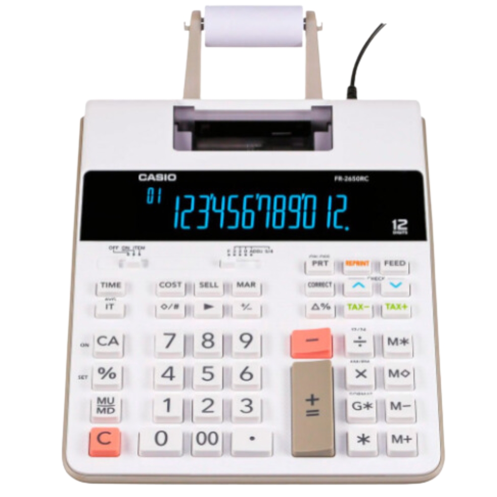 CALCULADORA CASIO FR-2650 12 DIGITOS REGISTRA E IMPRIME LAS OPERACIONES Y RESULTADOS DE DIVERSAS TRANSACCIONES,LOS VALORES NEGATIVOS SE IMPRIMEN EN COLOR ROJO, PARA SU FACIL COMPRENCION.