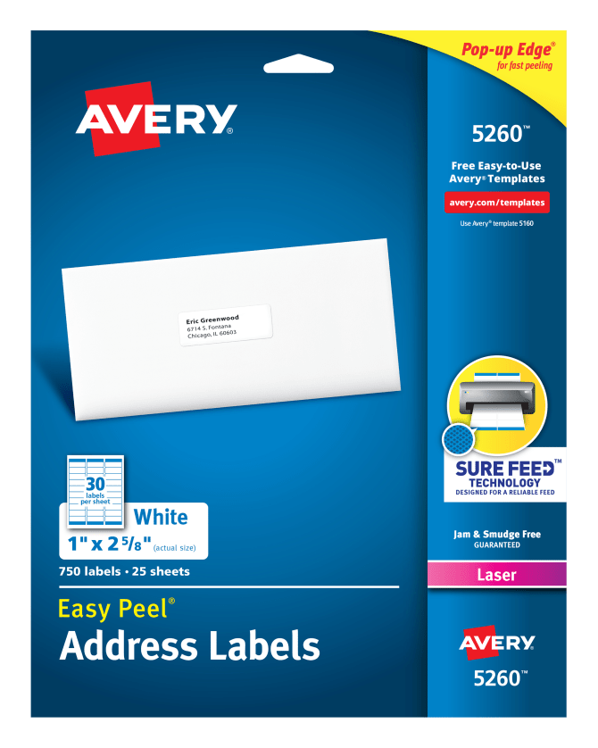 Avery 5260 Etiqueta Laser, color Blanco, 2.54 x 6.67 cm c/750